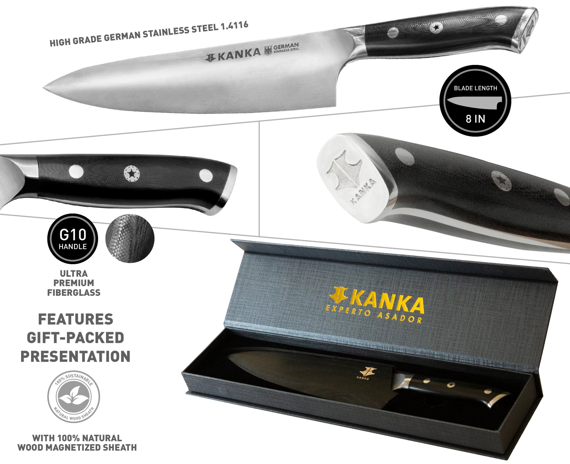 Professional Knife: Perfect balance between weight and blade length. 100% German steel with 'extreme edge'. Premium G10 fiberglass handle. Includes wooden sheath and an elegant presentation box for gift and storage.